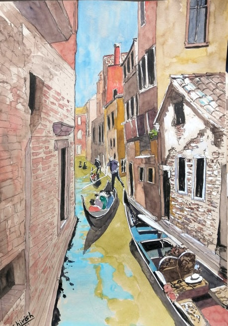 With each brushstroke and pen line, the artist captures the essence of Venice's unique charm and allure, inviting the viewer to lose themselves in the timeless beauty of the city's canals. Whether gliding along the water in a gondola or wandering the labyrinthine streets on foot, the painting evokes a sense of wonder and enchantment that lingers long after the canvas is left behind.
