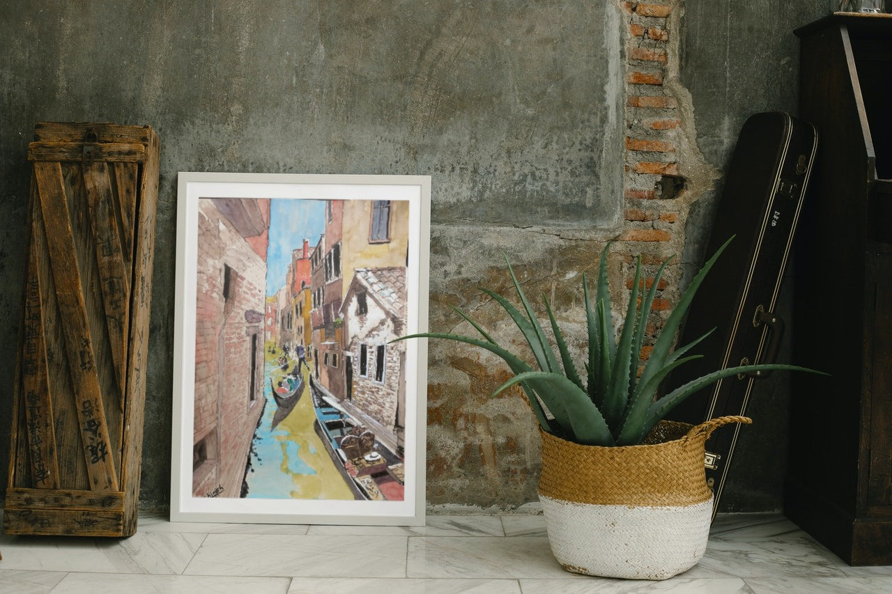In this captivating pen, ink, and watercolor painting, the viewer is transported to the enchanting canals of Venice, Italy, where the timeless beauty of the city's waterways unfolds in vivid detail. Flanked by ancient buildings with weathered stone walls, the canal exudes a sense of history and grandeur that is as captivating as it is evocative.