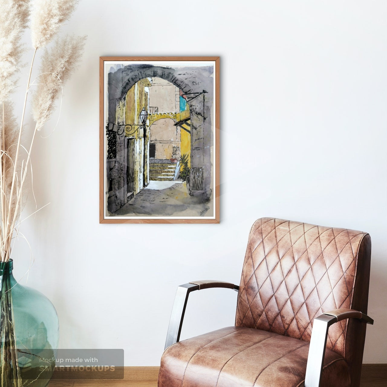 In this enchanting pen, ink, and watercolor painting, the viewer is transported to the picturesque streets of the Italian town of Castellabate, where history and beauty converge in a timeless embrace. A cobbled lane winds its way through a majestic stone archway, its rugged surface worn smooth by the passage of countless footsteps over the centuries.