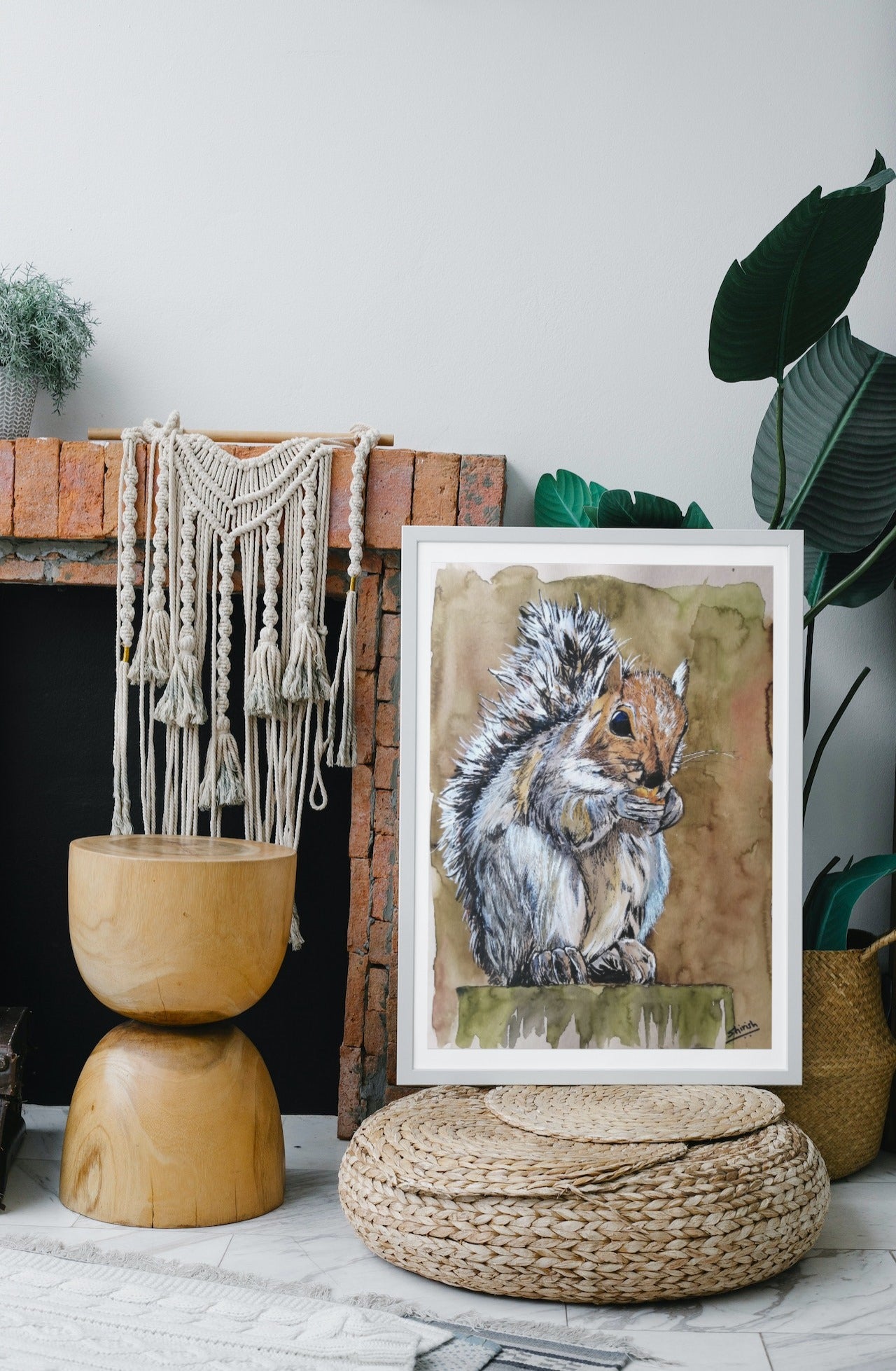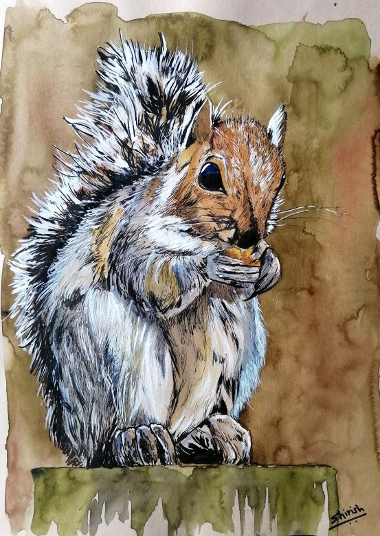 In this endearing pen, ink, and watercolor painting, the viewer is treated to a charming glimpse of nature's whimsy as a cute chipmunk indulges in a snack amidst the lush greenery of the jungle. With its thick grey and white fur standing out against the rich browns and vibrant greens of its surroundings, the chipmunk exudes a sense of innocence and curiosity that is as captivating as it is adorable.