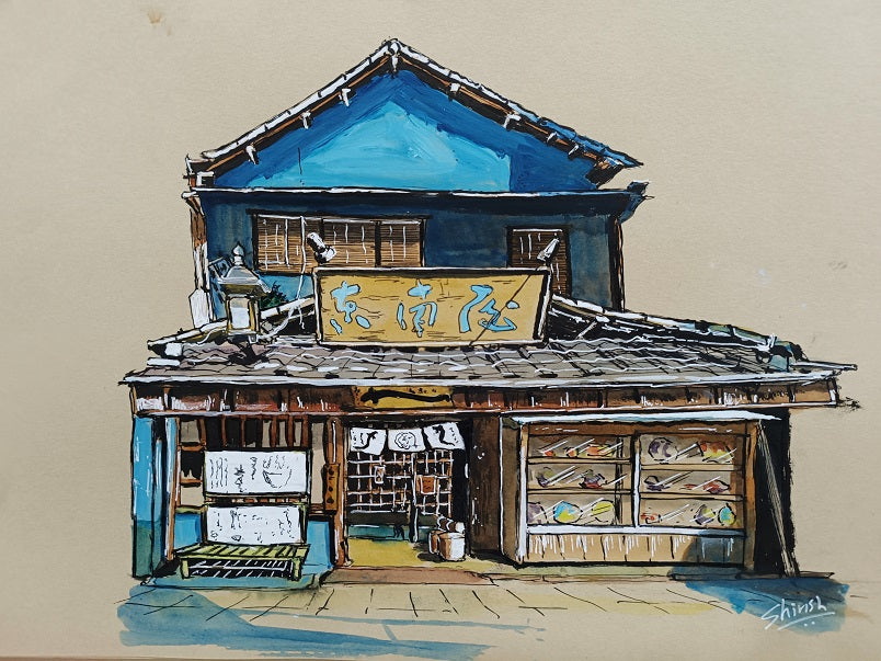In this delightful pen, ink, and watercolor painting, the viewer is invited to step into the cozy embrace of a charming Japanese cafe nestled within the confines of an old wooden building. The weathered facade, with its neutral grey and brown hues, exudes a sense of timeless charm and rustic elegance. Yet, amidst the subdued tones of the structure, a vibrant splash of color catches the eye - a bright blue wall that adds a playful pop of contrast and whimsy to the scene.