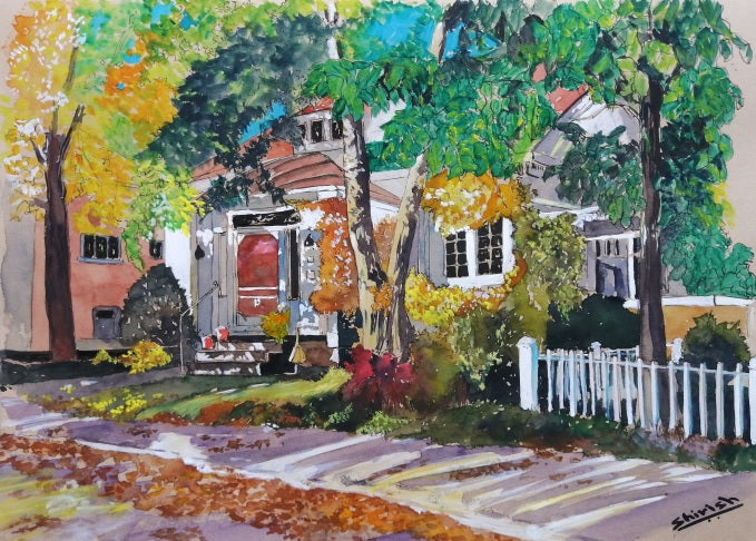 In this enchanting pen, ink, and watercolor painting, the vibrant beauty of autumn comes alive in a kaleidoscope of colors. A quaint white house, with its charming red roof and door, stands as a beacon of warmth and comfort amidst the riot of foliage that surrounds it. The house is nestled within a landscape ablaze with the fiery hues of fall – golden yellows, burnt oranges, and rich reds paint the trees and bushes that encircle the property.