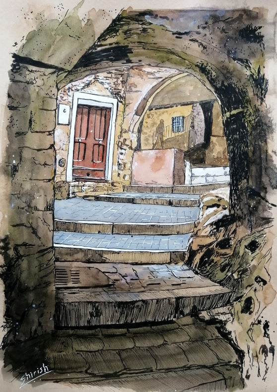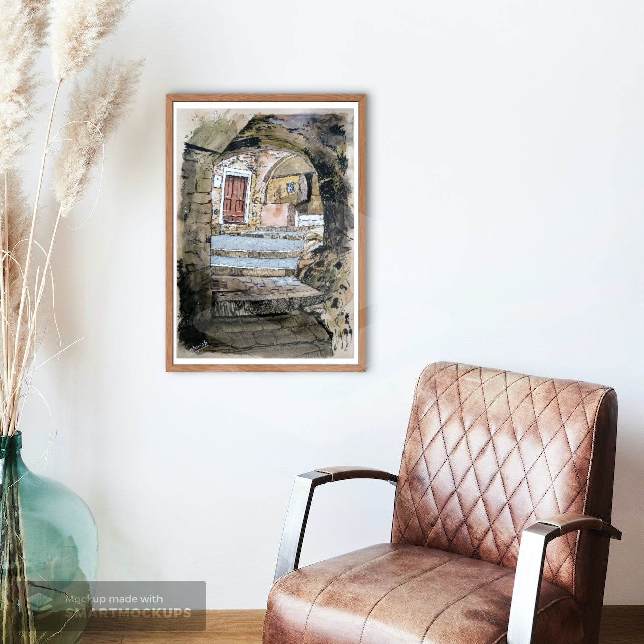 In this evocative pen, ink, and watercolor painting, the viewer is transported to the picturesque town of Castel del Monte in Italy, where a stone archway offers a tantalizing glimpse of the world beyond. Framed by the weathered stone of the arch, the scene unfolds with a sense of timeless beauty and quiet intrigue.