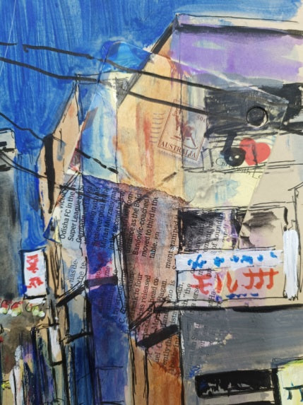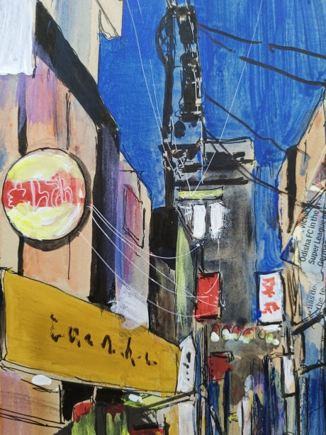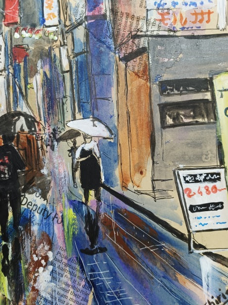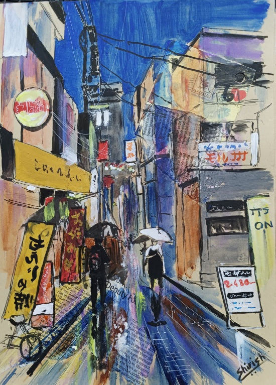 In this mesmerizing mixed-media painting, the viewer is transported to a vibrant rainy night in a bustling Japanese city. Against the backdrop of a dark, stormy sky painted in rich shades of blue, the streets come alive with the glow of bright yellow signage, casting a warm and inviting light that cuts through the darkness.
