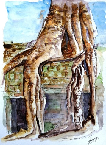 Viajé a Siem Reap en 2019 para visitar estos templos y experimentar su dibujo en el lugar. El viaje resultó ser una experiencia enriquecedora y meditativa para mí. También me di cuenta de que dibujar y pintar las ilustraciones de estos antiguos templos era una experiencia igualmente encantadora y desafiante.