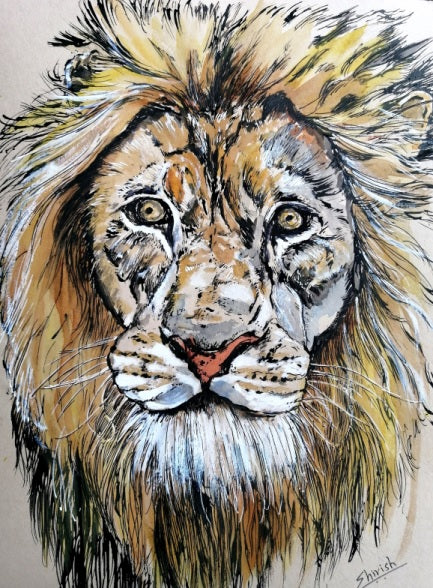 In this mesmerizing pen, ink, and watercolor portrait, the majestic lion emerges as a powerful symbol of strength, grace, and untamed beauty. With penetrating eyes that seem to pierce through the canvas, the lion commands attention and respect, exuding an aura of regal authority and primal instinct. Every stroke of the artist's pen captures the intricate details of the lion's mane, a magnificent crown of golden fur that frames its noble visage with a mesmerizing blend of light and shadow. In the background, hints of the lion's natural habitat add depth and context to the portrait, transporting the viewer into the heart of the African savannah where this fearsome yet fascinating creature reigns supreme. With its combination of precise line work and expressive watercolor washes, this portrait captures the essence of the lion's wild spirit, inviting viewers to contemplate the timeless allure of nature's most iconic predator.