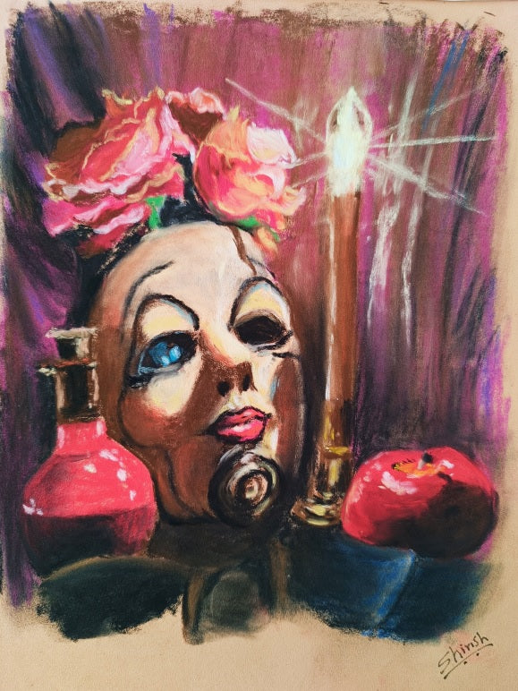 Enter the realm of mystery and intrigue with this captivating soft pastel painting! 🎨✨ Behold the enigmatic allure of a haunting mask, its hard features softened by the gentle strokes of pastel against a backdrop of deep purple drapes. Bathed in the flickering glow of a solitary candle, shadows dance around the mask, weaving tales of secrets and whispers. Above its head, a pair of bright pink flowers adds a touch of delicate beauty, while on either side, a red apple and a mysterious pink bottle beckon with their own stories. But what's this? A faint, ethereal blue light peeking from behind one of the mask's eye holes, hinting at hidden depths and unseen mysteries. Let this artwork transport you to a world where every stroke unveils a new layer of enigma and wonder. 🔮🌺 #MysticalMask #ArtisticIntrigue