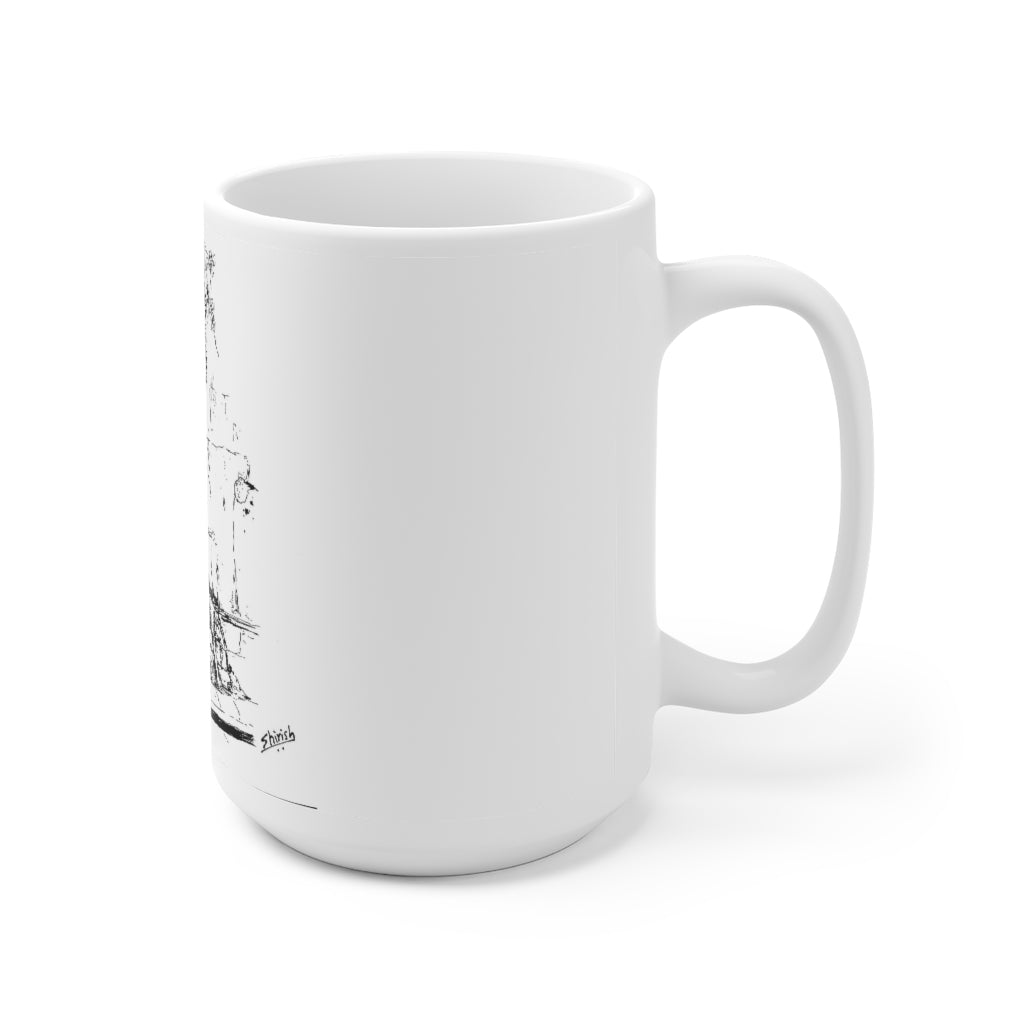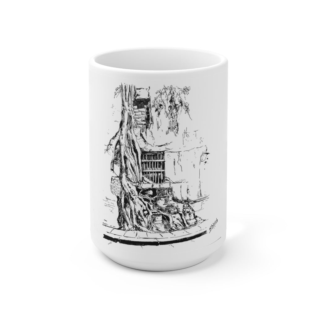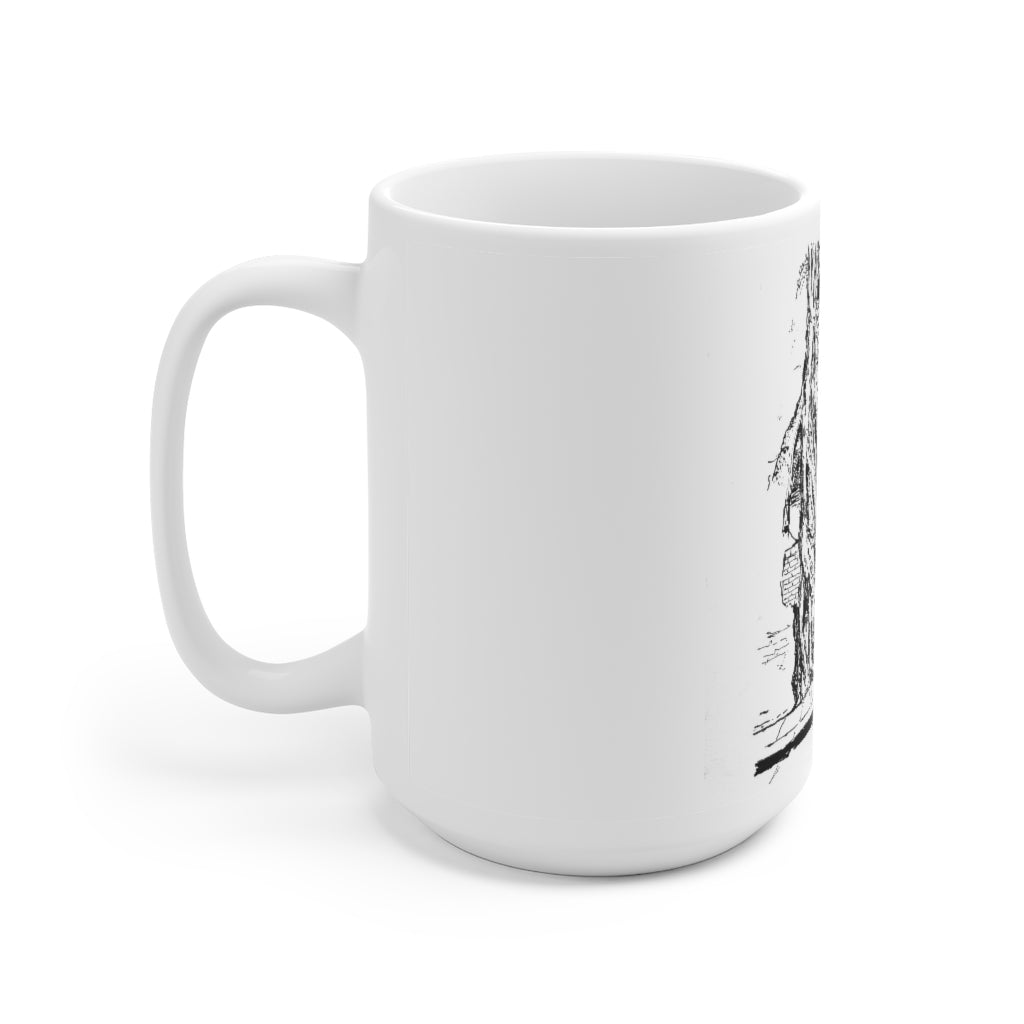 White Ceramic Mug 15oz - Minimalistic Monochrome Design of Old Wall and a Tree